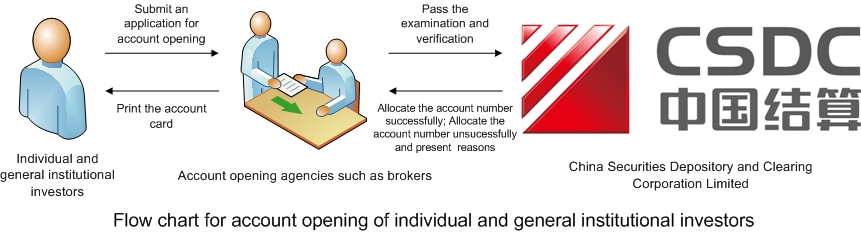 To open a securities account, individual and general institutional investors go to the business department of a securities company. Such securities companies and other account-opening agencies are entrusted by the CSDC to accept applications from investors, and the CSDC opens securities accounts for and in the name of investors. To be specific, investors must first submit an application for account opening to the securities company together with their valid identity documents. Upon receipt of the application, the securities company carefully examines and verifies these documents and other information provided by the investors to make sure that they are authentic, accurate and complete. Afterwards, the securities company submits the information on qualified applications to the CSDC via the account opening system. Through necessary examination and verification, the CSDC allocates a securities account number and feeds it back to the securities company, and then the securities company prints and issues a securities account card to the investor. Thus, the securities account opening formalities are completed. With a securities account, investors can immediately entrust their securities to a securities company for trading.