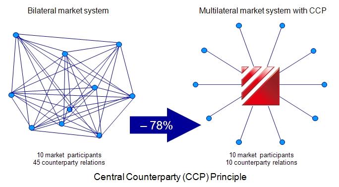 (II) Central Counterparty (CCP) Principle. In this clearing process, CSDC gets involved in the securities transaction and becomes the settlement counterparty of all the buyers and sellers to ensure the successful completion of the settlement. The CCP principle helps simplify the clearing process and improve efficiency. At the same time, CSDC can manage collectively the credit risks of counterparties in the market according to clearing and settlement business rules, which is conducive to controlling and reducing the overall market risks. As shown in the following figure, when there are 10 participants in the market, there are altogether 45 counterparty relations. If CSDC acts as the CCP, only 10 counterparty relations are needed, and the number of counterparty relations can be downsized by 78%.